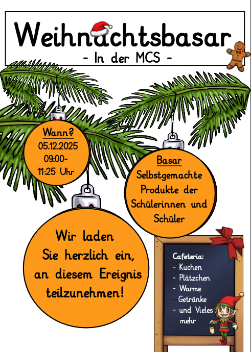 Am 05.12.2025 von 09:00 Uhr bis 11:25 Uhr verwandelt sich unsere Schule in eine stimmungsvolle Weihnachtswelt. Zahlreiche liebevoll hergestellte Produkte, eine gemütliche Cafeteria, kreative Bastel- und Spielangebote sowie kleine weihnachtliche Auftritte einzelner Klassen sorgen für eine festliche Atmosphäre und viel Abwechslung.
