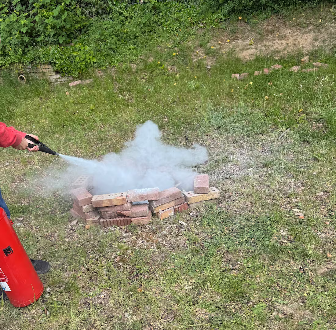 Auch das Löschen eines Feuers mit einem Pulverfeuerlöscher haben die Schüler:innen selbstverständlich geübt.